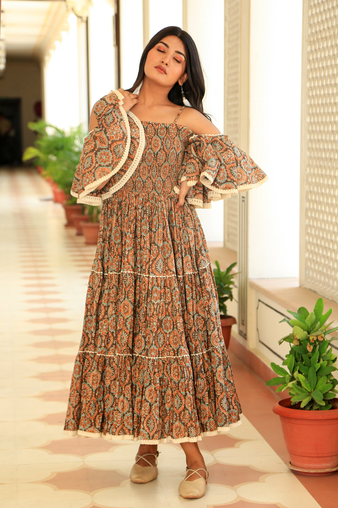 This Cold shoulder umbrella flair bagru print dress crafted in Cotton, Features Cold Shoulder with Ruffled Sleeve, Flared Hem & Calf Length.