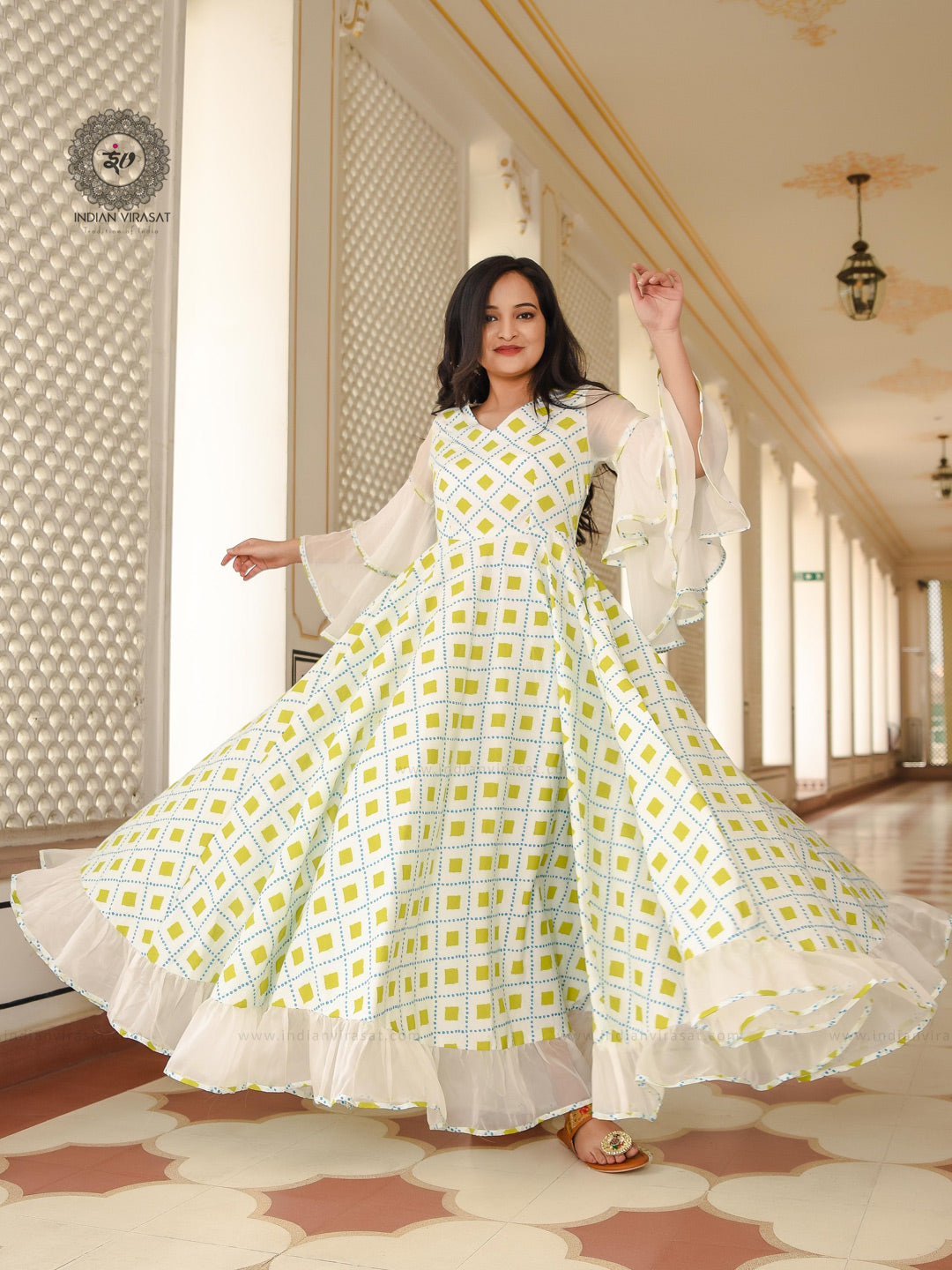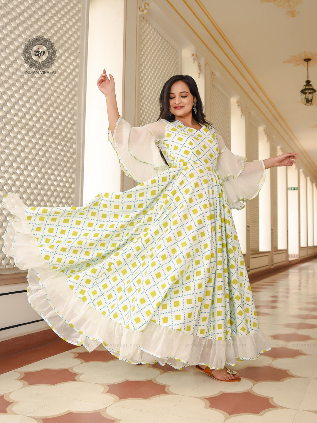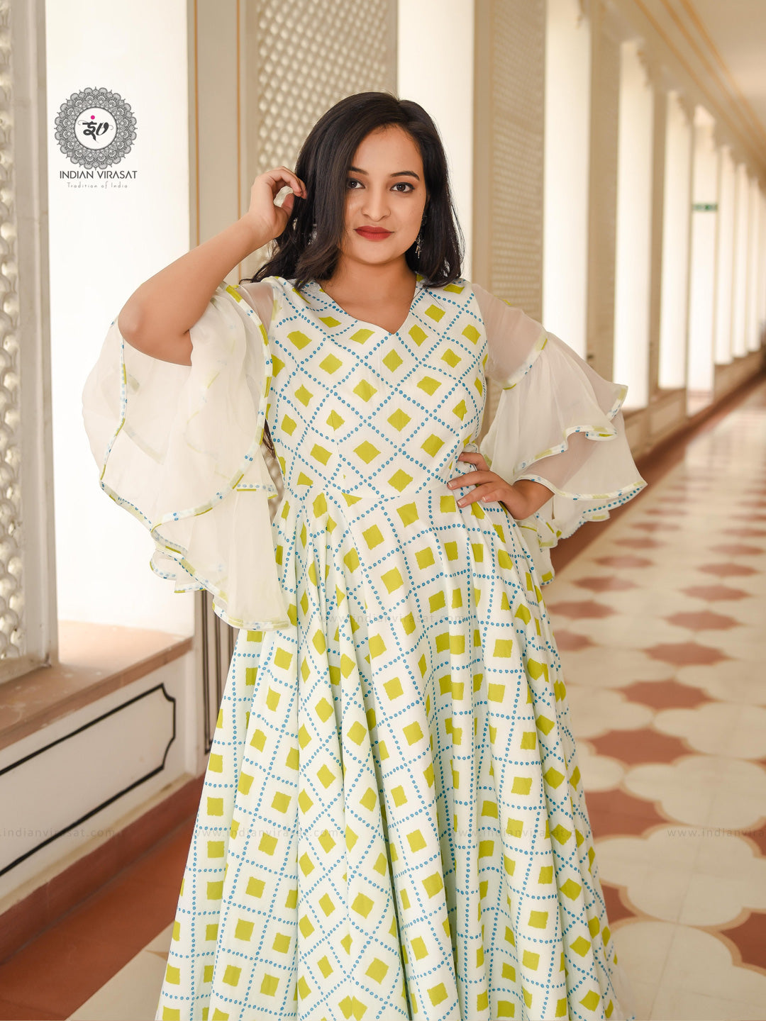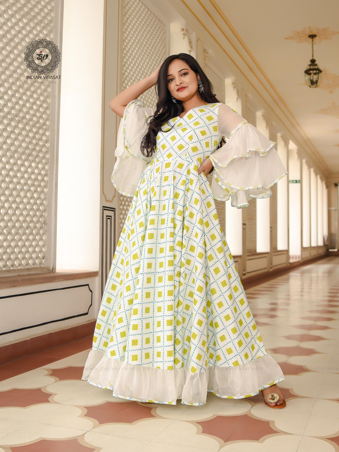 This Powder White printed Dress crafted in Cotton, Features Sweetheart Neck with Angel Ruffled sleeves, Flared Hem, Floor Length, Zip closure & Lining.