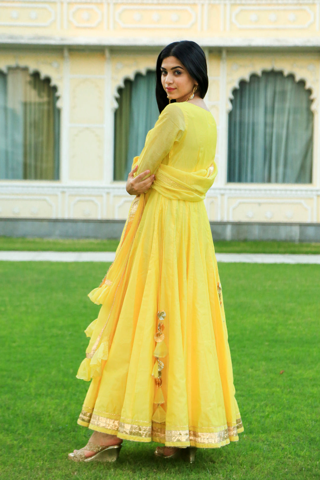 This Pineapple Yellow Anarkali Dress crafted in Chanderi, Features Round Neck with 3/4 Sleeves, Zip closure & Lining.
