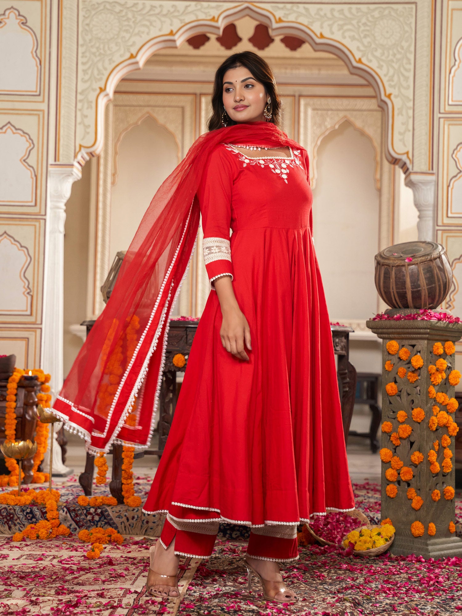 Radiate festive charm in our stunning Cerise Red Anarkali Suit Set, paired with a graceful Supernet dupatta. Designed for the perfect twirl, this vibrant ensemble ensures you shine like a star at every celebration, making unforgettable style statements this season.MaterialKurta fabric: Pure CottonBottom fabric: Pure CottonDupatta fabric: SupernetLining: With Lining