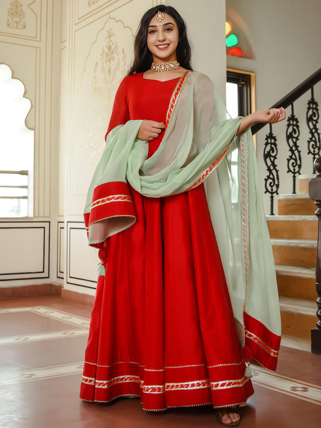 Product DetailsThis Crimson Red Gown crafted in Chanderi, Features Dimond Neck with 3/4 Sleeve, Flared Hem, Ankle Length, Zip closure & Lining.