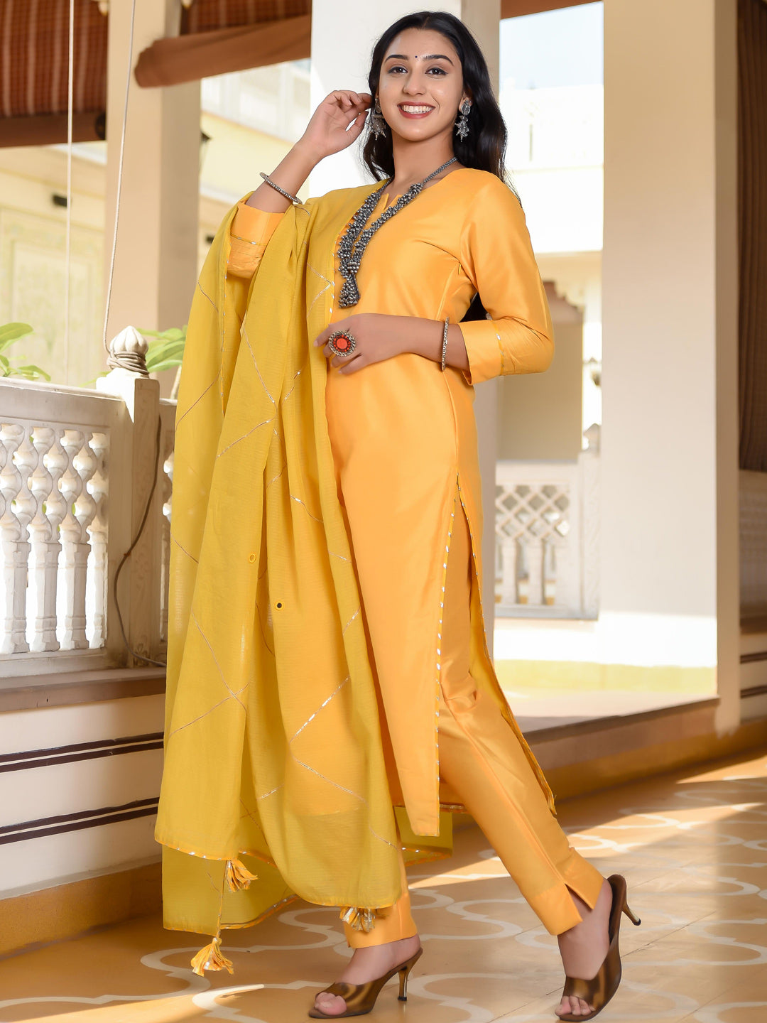 Complete The LookMerge tradition and modern fashion in this Happy yellow silk kurta set and feel feminine and modest for any occasion. Wear this kurta set with elegant heels for a fashion-forward look.Product DetailsThis Mesmerizing Happy Yellow Solid Straight Kurta crafted in Silk Blend, Features V-Cut Round Neck with 3/4 Sleeve, Calf Length & Lining. Bottom Crafted in Silk Blend with elasticated waistband & Pockets and dupatta has Gota WorkSize & FitThe model (height 5'7") is wearing a size XSMaterial & CareKurta fabric: Silk BlendBottom fabric: Silk BlendDupatta fabric: Silk BlendWashing Instructions: Dry Clean OnlyDisclaimer: PRODUCT COLOUR MAY SLIGHTLY VARY DUE TO PHOTOGRAPHIC LIGHTING SOURCES OR YOUR MONITOR SETTINGS.
