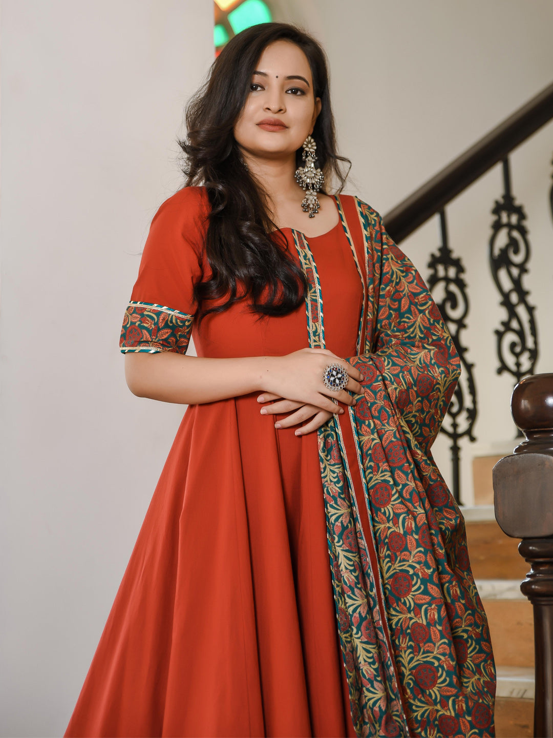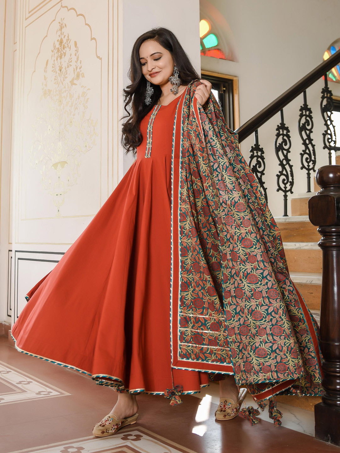 Complete The LookCelebrate your personal style and roots with this elegant Garnet Anarkali set with bagh print bottom & dupatta. Celebrate the romantic, eccentric, and traditional qualities of this Suit set by pairing it with matching accessories.