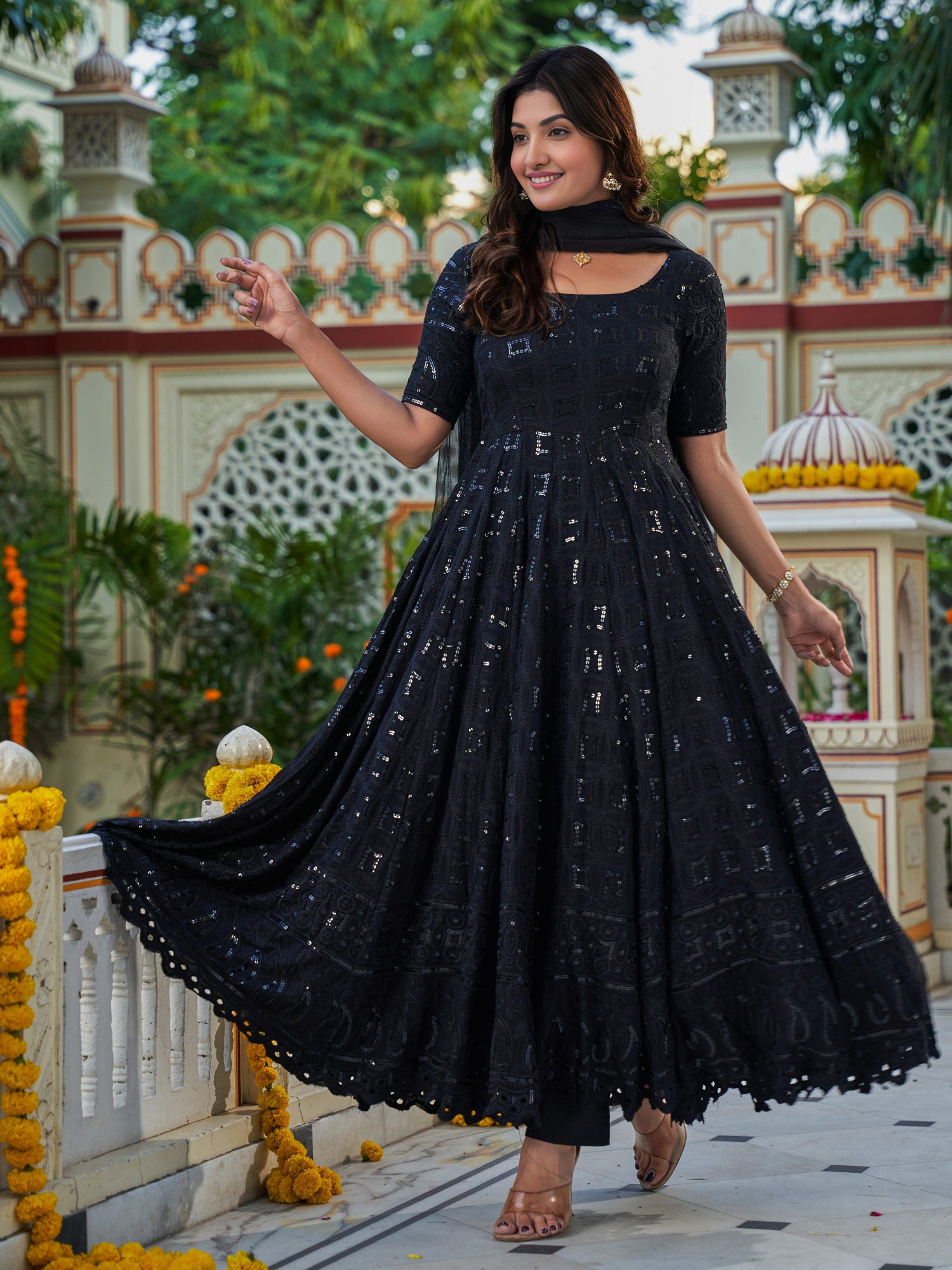 Launching our elegant Saiyaara Black Anarkali Suit Set, paired with a dupatta featuring heavy lace work. With Deep neck and backlace look All over heavy Embroidery, this graceful outfit is perfect to twirl in style this festive season.�������MaterialKurta fabric: Cotton schiffli��Bottom fabric: Cotton schiffliDupatta fabric: SupernetLining: With Lining