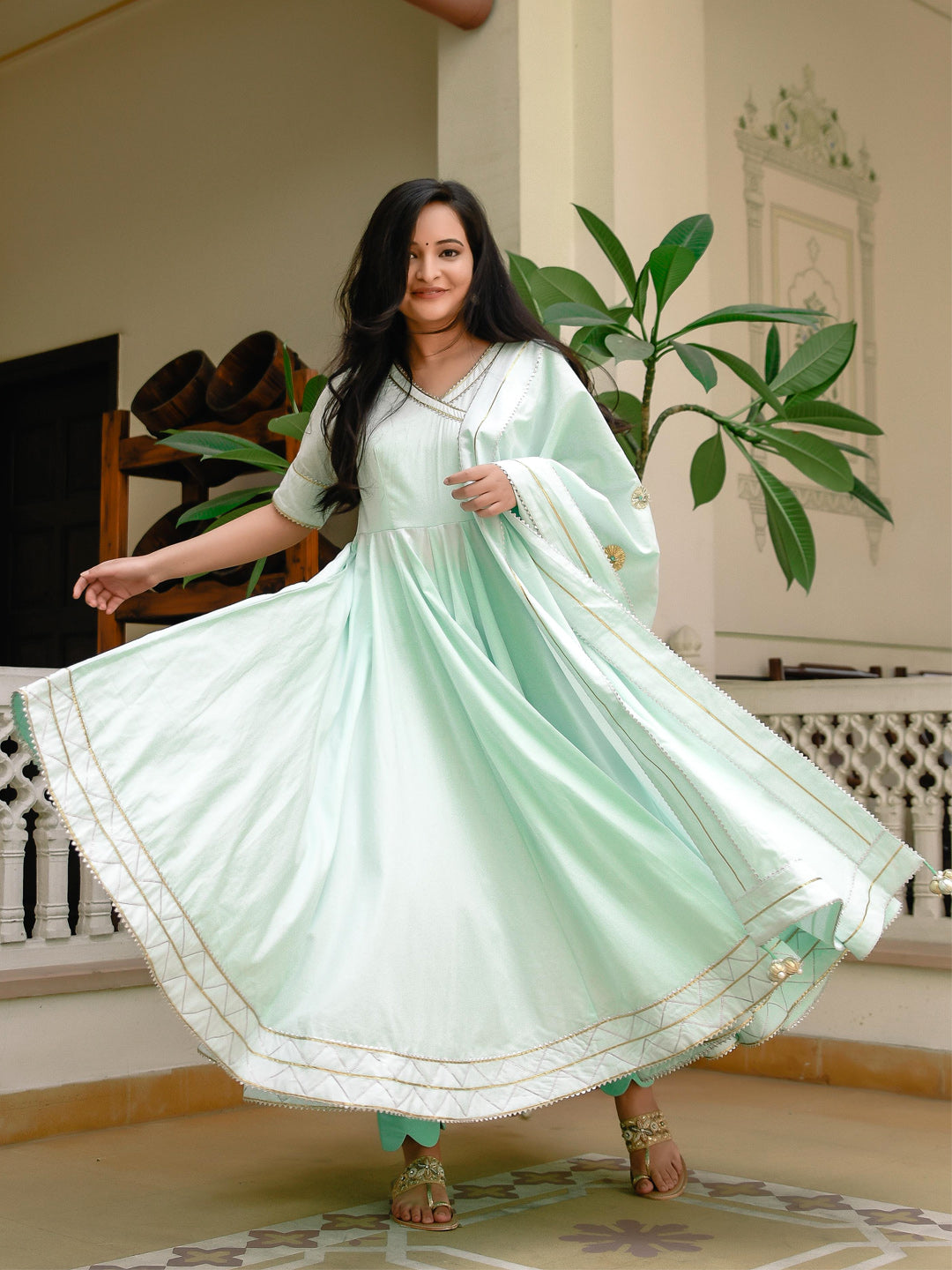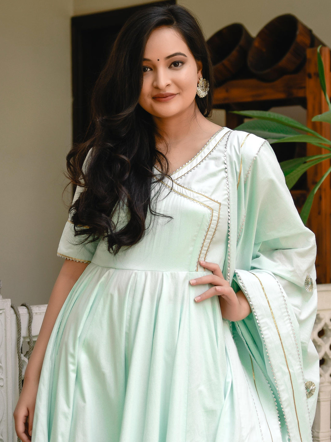 Complete The LookAmp up your glamour quotient by wearing the pantone Cotton suit. Featuring a romantic plain pattern, the suit comes with Gota neckline that renders its elegance. This pantone piece is a stylish option for a nice family gathering or festivities.Product DetailsThis Pantone Anarkali Kurta crafted in Cotton, Features Cross Neck with Half Sleeve, Calf Length, Zip Closure, One Side Pocket & Lining.Bottom Crafted in Cotton with elasticated waistband and Organza Dupatta has Gota WorkSize & FitThe model (height 5'7") is wearing a size XSMaterial & CareKurta fabric: CottonBottom fabric: CottonDupatta fabric: OrganzaWashing Instructions: Dry Clean OnlyDisclaimer: PRODUCT COLOUR MAY SLIGHTLY VARY DUE TO PHOTOGRAPHIC LIGHTING SOURCES OR YOUR MONITOR SETTINGS.