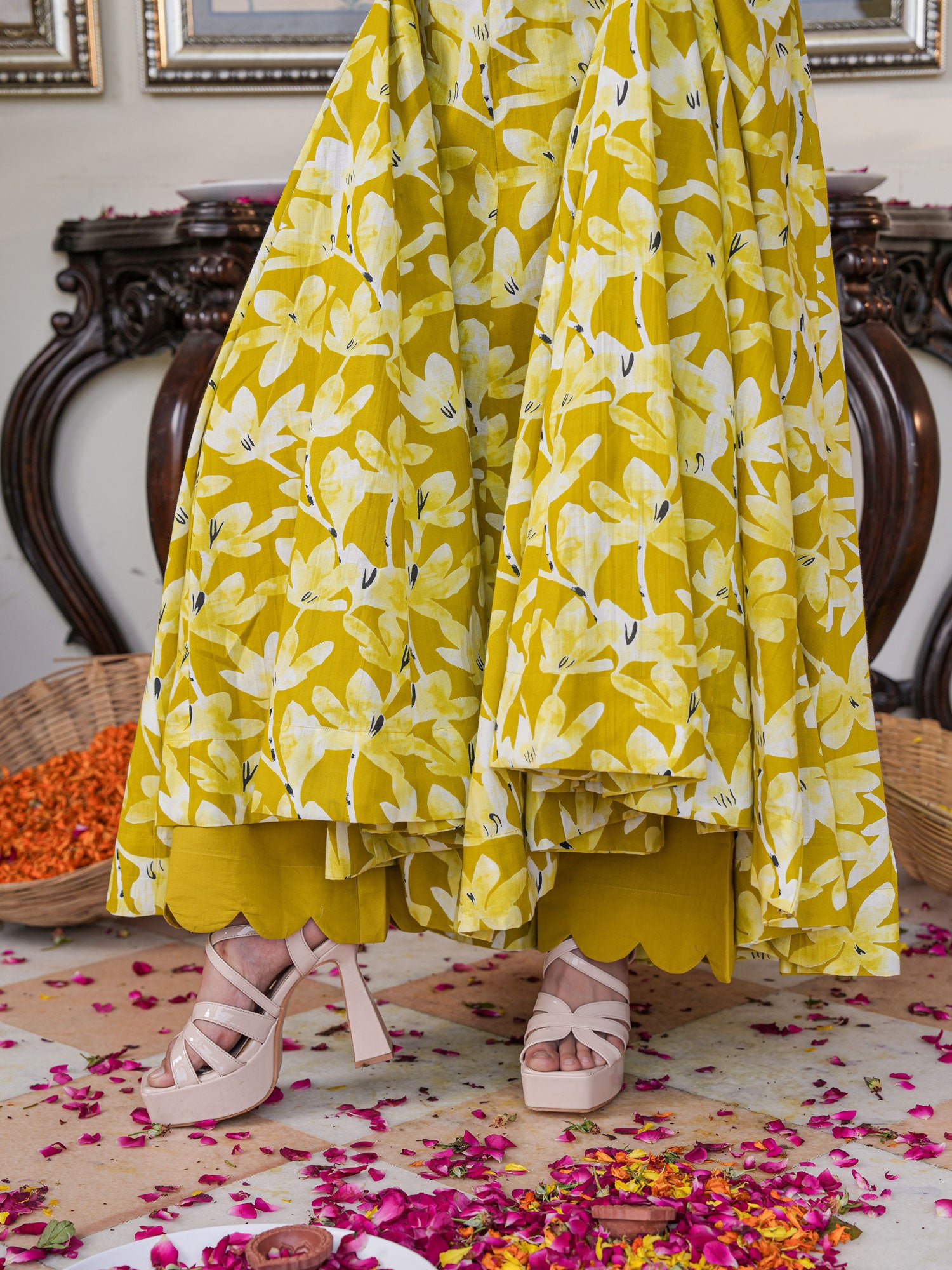 Radiate festive charm in our stunning mustard anarkali suit set, paired with a graceful Silk Chiffon dupatta. Designed for the perfect twirl, this vibrant ensemble ensures you shine like a star at every celebration, making unforgettable style statements this season.���MaterialKurta fabric: Pure CottonBottom fabric: Pure CottonDupatta fabric: Silk ChiffonLining: With Lining