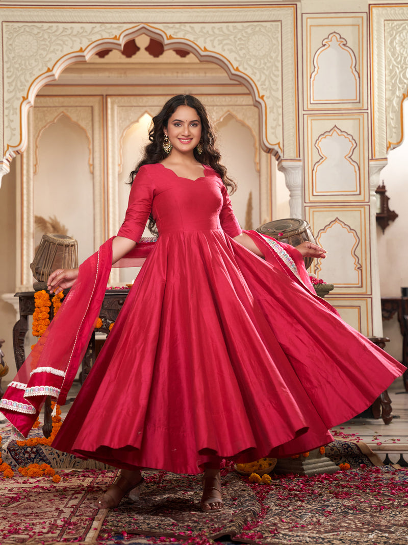 Step into festive elegance with our graceful Rose Blossom Pink Anarkali suit set, beautifully adorned with delicate threadwork lace. Designed to flow and twirl with every move, this charming outfit adds a soft glow to your look, helping you shine effortlessly at every celebration.