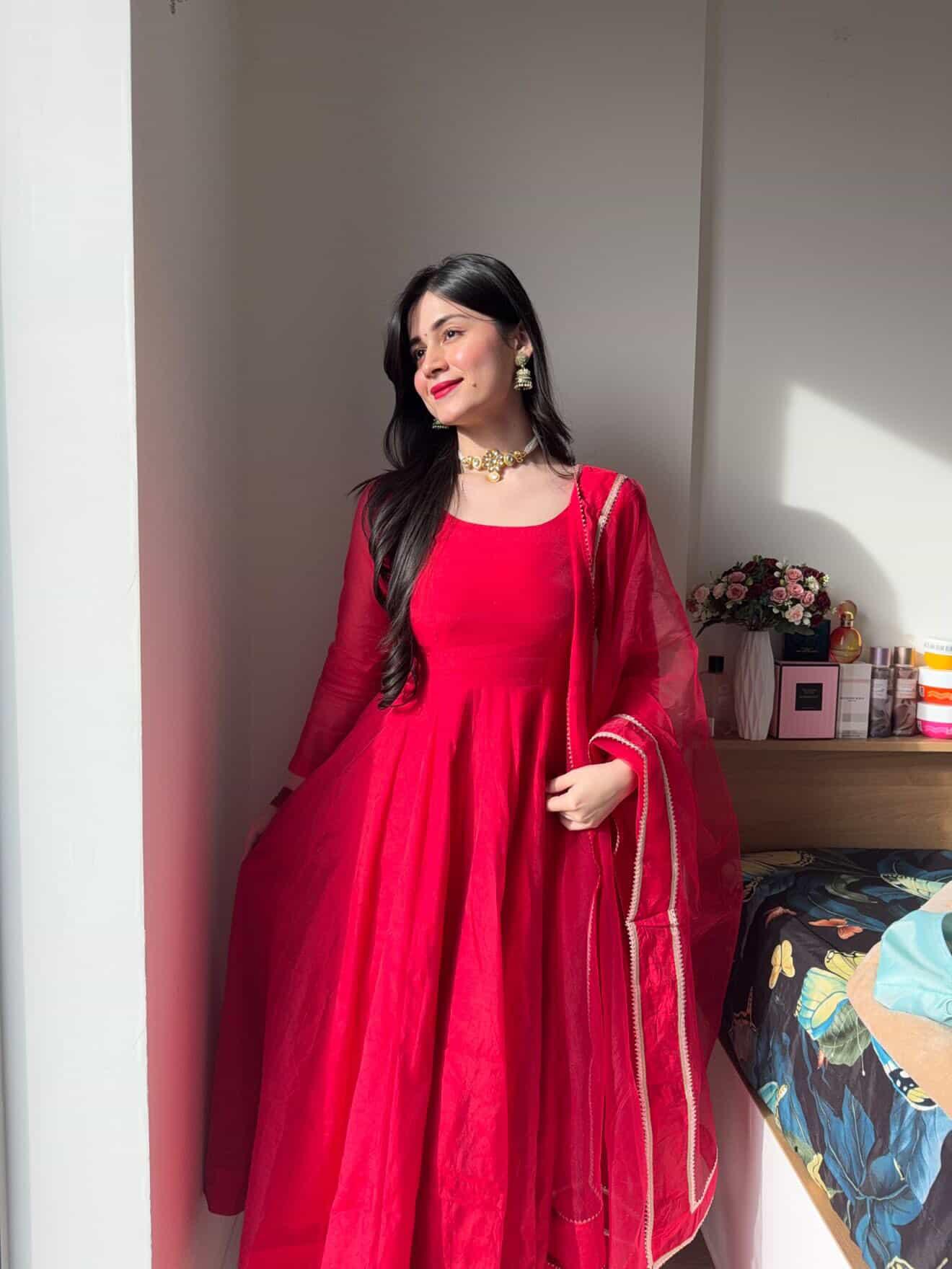 The red color looks absolutely rich and vibrant. The Anarkali flare gives a royal and graceful appearance.